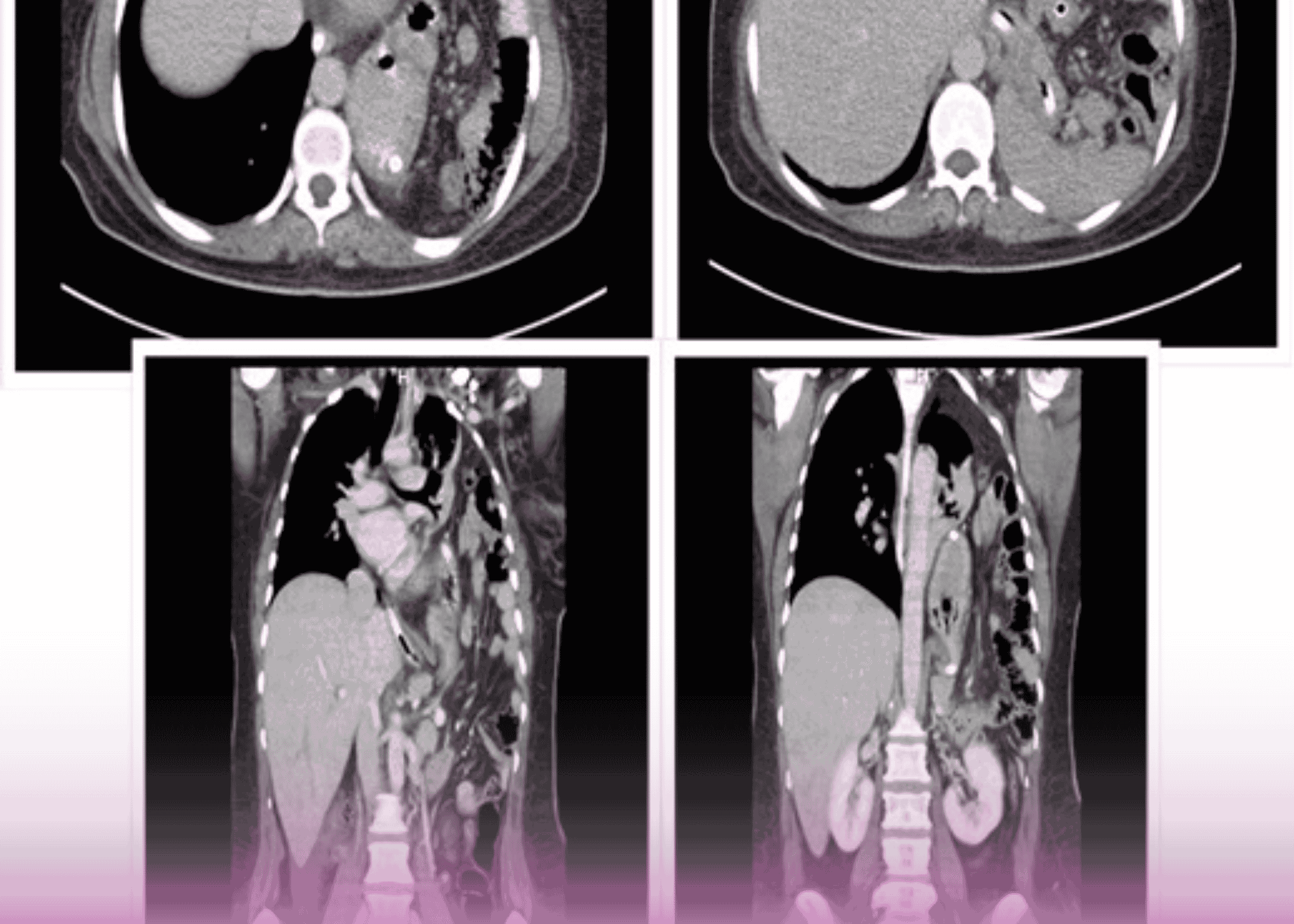 - الأشعة المقطعية للبطن والصدر: أظهرت وجود عيب كبير في نصف الحجاب الحاجز الأيسر مع فتق لعدة أعضاء بطنية إلى التجويف الصدري الأيسر، بما في ذلك: