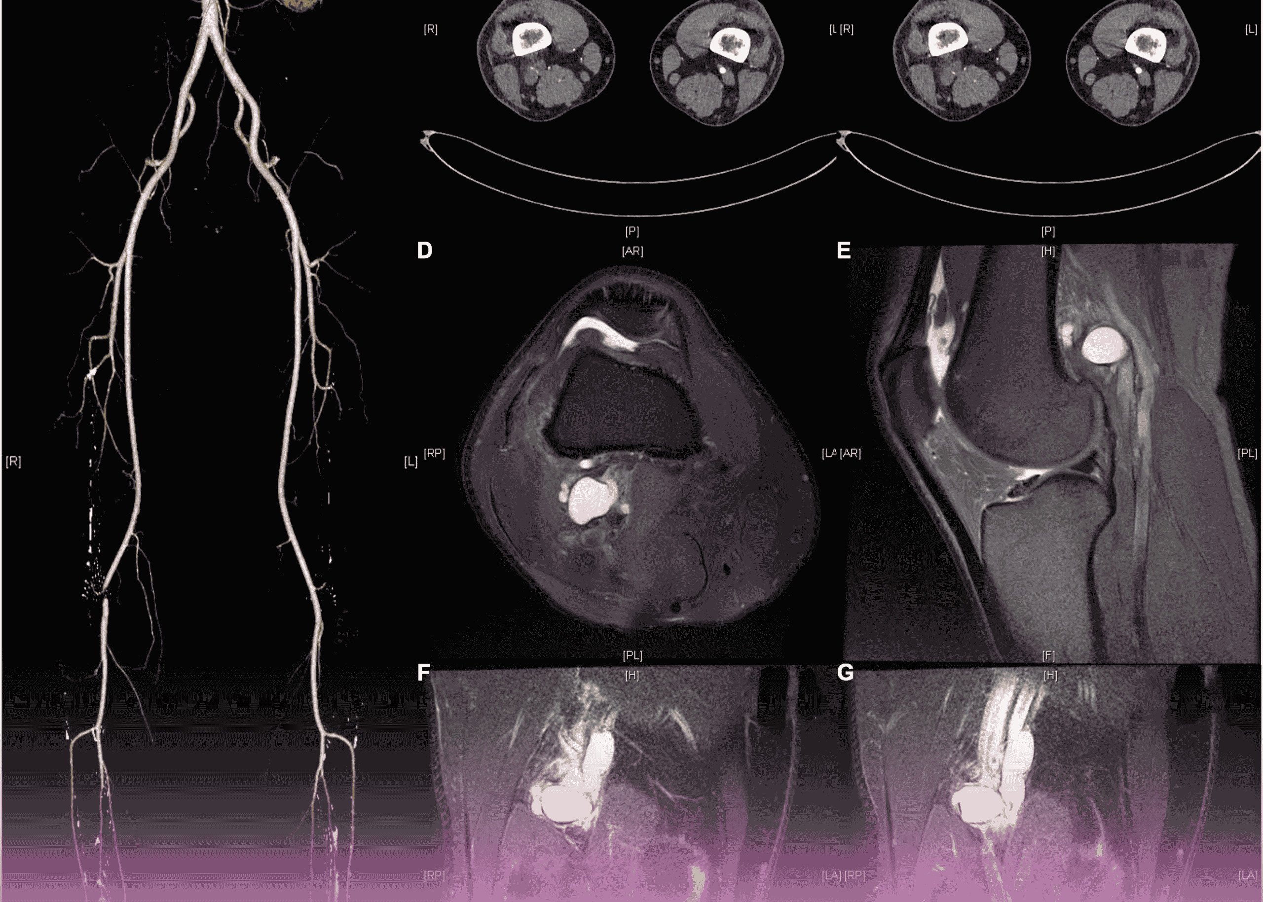 CT angiogram and MRI examinations of the right knee revealed an unusual finding: cystic adventitial disease affecting the popliteal artery. This exceedingly rare vascular disorder involves cystic degeneration in the wall of an artery, most commonly occurring in the popliteal artery behind the knee.